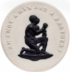 In the 1780s, there was a growing anti-slavery movement in Britain focused on stopping the trans-Atlantic slave trade. In 1787, the Society for Effecting the Abolition of the Slave Trade, arguably the first peaceful social movement in British history, asked Wedgwood to create an official ‘seal’ or logo for their campaign. The ceramic medallion has a raised image of a black man on a white background on one knee with chains and manacles on his wrists and ankles. Around the outer edge is the question: “Am I not a man and a brother?”